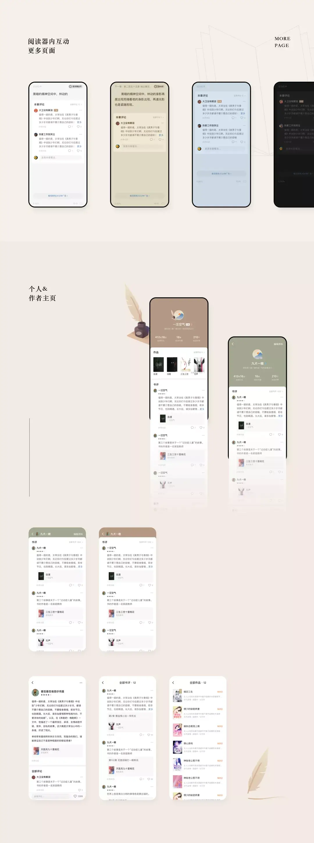 正如我们对文学的分析,小说阅读同样是一种独立个体的行为方式,在读书时,我们不希望被人打扰,不希望被琐事细节阻断,我们希望在一个相对安静、舒适的环境下阅读,这是一种沉浸式的感受。因此这里我们就根据用户的想要的感受,引入“沉浸”的概念——希望能够给读者留下一定的空间,并抛除繁杂打扰,让大家享受阅读与独立思考。其核心是围绕信息内容本身而呈现,设计不再作为独立于内容之外的元素存在,而将着眼于内容本身,为用户打造直观的视觉体验。拉大层级对比,增加适当的留白,在一定程度上增加少许修饰,打破绝对的冷淡。其既能体现出文学的特点,又能够在简约的基础上增加画面的构成感,给用户愉悦的感受。