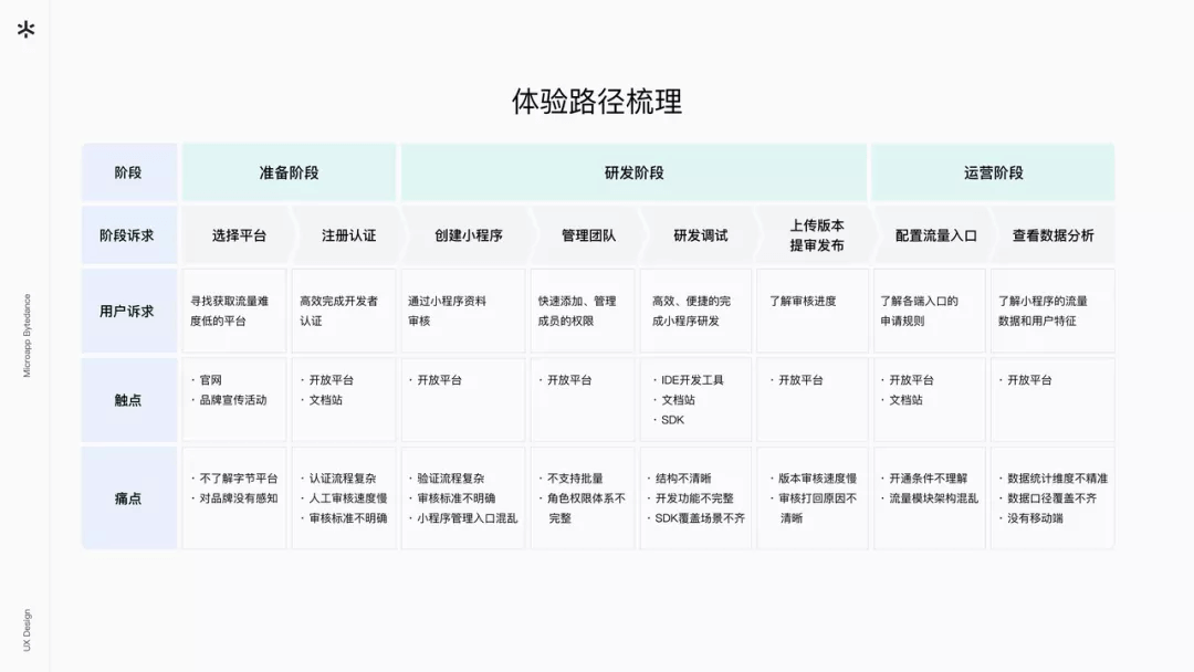小程序平台在导航框架上同样存在上述问题。于是我们通过用户访谈以及调研,重新梳理了不同角色的工作场景。以企业开发者为例,我们梳理了管理,产品,运营,研发,财务五种不同角色的场景和诉求。