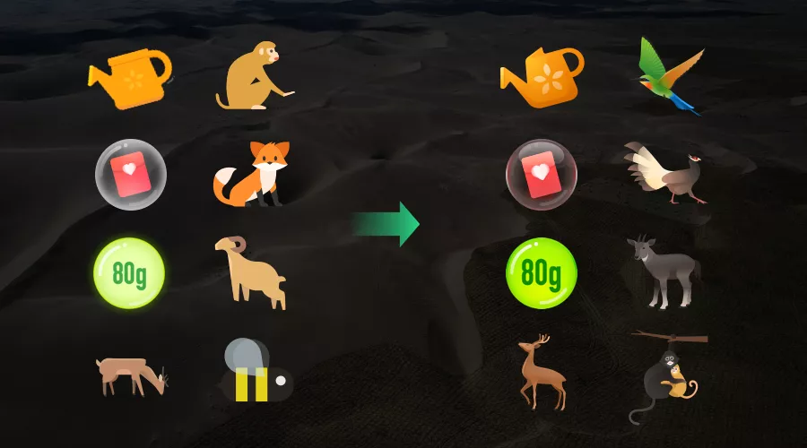 随着用户种树的进度,画面会从沙漠慢慢变成绿地。大色块的做法只能通过颜色表达变化,差异性有限,给人的视觉冲击并不够强。通过由近及远的视觉变化,搭配微质感,可以让用户明显感受到种树如何为沙漠带来绿色,同时白天和夜晚的差别也会更大。