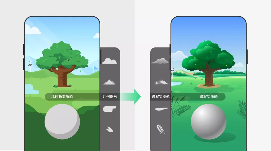 图形、配色和质感越往右边走,我们的视觉感官就会愈发真实。但100%的真实往往细节过多、成本高昂,对产品设计来说未必是好事。因此,经过多版本尝试,我们把改版的视觉风格定位在了“微质感”上。