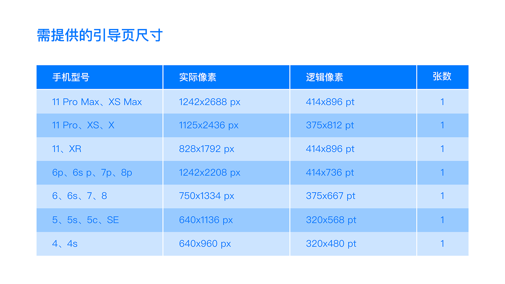 引导页是一张完整图,不能适配,因此需要单独出设计图,iOS共需提供6套尺寸,当然也支持视频形式。(目前5以下的适配基本淘汰)