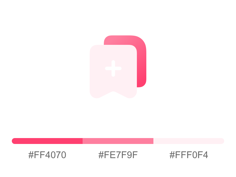 绘制好需要的图形之后,进行如图组合。按照图中将三个元素分为前层、中层、背景层三层,加号为前层采用白色( 色值:#FFFFFF );中层色值:#FFF0F4;背景层采用的是左上角到右下角的斜角渐变,色值为:#FE7F9F 到 #FF4070 进行渐变。