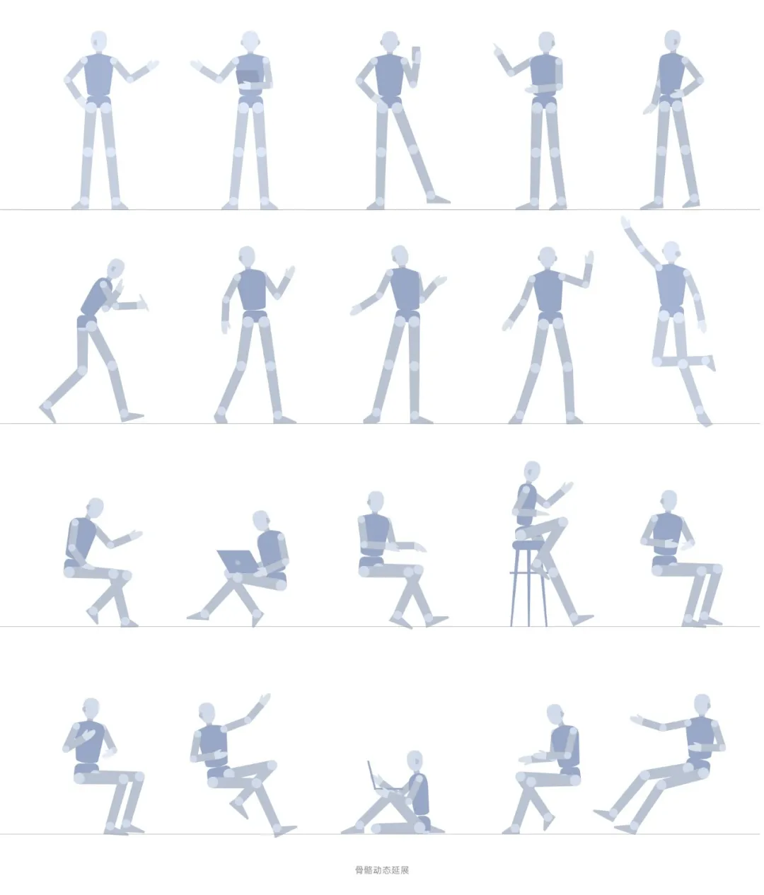 有了基本的角色设计和规范,我们将人物角色进行拆解,拓展了不同的人物角度、人物表情,并结合人物基础骨骼延伸出各种人物动态,方便不同场景中的应用。