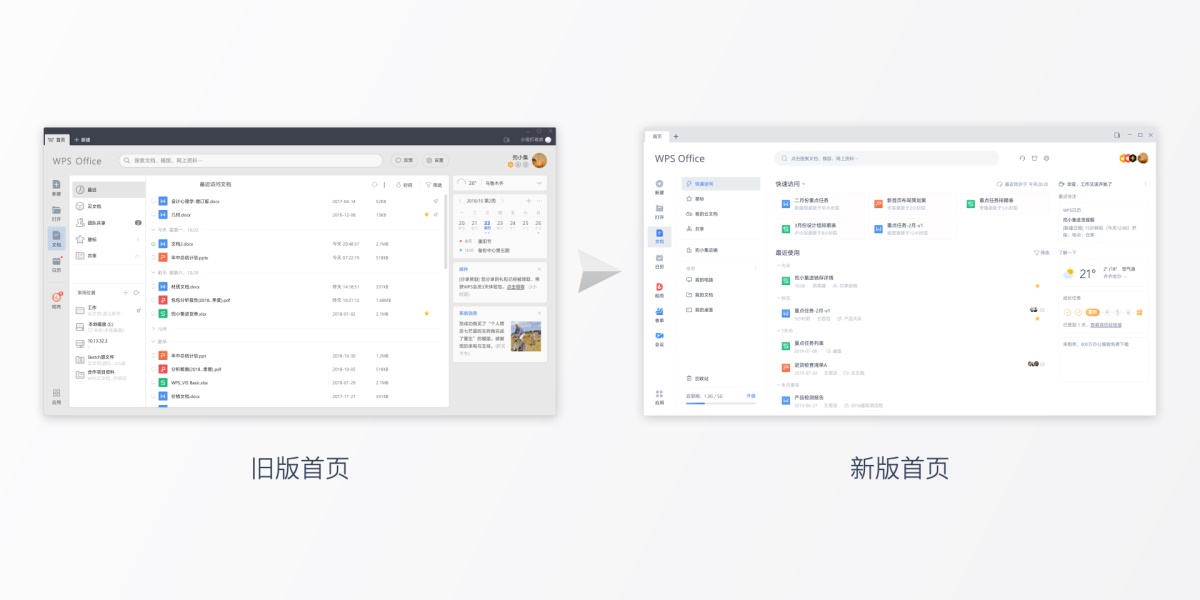 为了更好的用户体验,此次版本,对 WPS PC端、移动端的新首页与组件页进行了全新视觉升级,采用扁平直的视觉基调,确保让用户更专注于内容本身。