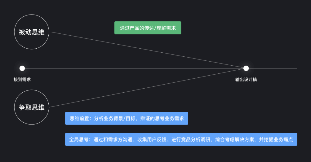 设计师要学会转被动为主动,才能很好的发挥设计价值。本身设计与产品的配合就是相互成就的,大家的目标都是一致的。面对B端复杂的业务需求,在和产品思维对焦时,需要设计师思维前置,辩证的去思考产品方向,帮助产品梳理需求,从需求背景出发,收集用户、需求方的反馈,综合考虑根本要解决的问题是什么,再去想如何产出设计方案,不要只被动的承接需求。平衡当前资源实现业务方要求的功能,让用户体验易用性,从而提高业务效率。