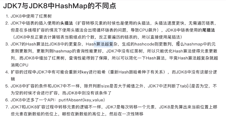 (1)HashMap是一种散列表,采用(数组 + 链表 + 红黑树)的存储结构;(2)HashMap的默认初始容量为16(1<<4),默认装载因子为0.75f,容量总是2的n次方;(3)HashMap扩容时每次容量变为原来的两倍;(4)当桶的数量小于64时不会进行树化,只会扩容;(5)当桶的数量大于64且单个桶中元素的数量大于8时,进行树化;(6)当单个桶中元素数量小于6时,进行反树化;(7)HashMap是非线程安全的容器;1.在JDK1.7中,当并发执行扩容操作时会造成环形链和数据丢失的情况。2.在JDK1.8中,在并发执行put操作时会发生数据覆盖的情况。(8)HashMap查找添加元素的时间复杂度都为O(1);(9) HashMap 允许插入键为 null 的键值对。但是因为无法调用 null 的 hashCode() 方法,也就无法确定该键值对的桶下标,只能通过强制指定一个桶下标来存放。HashMap 使用第 0 个桶存放键为 null 的键值对。