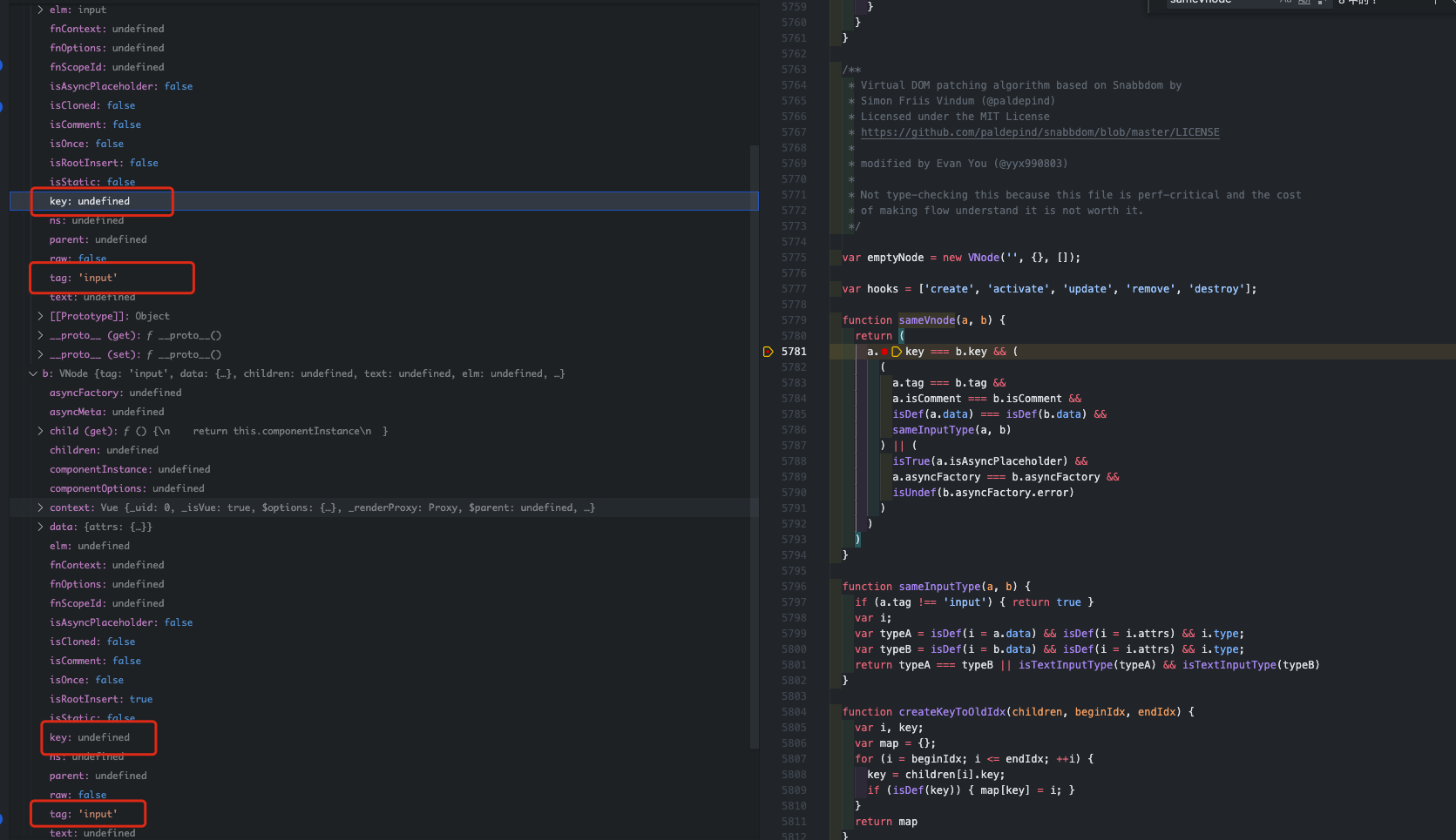 function sameVnode(a, b) {return (a.key === b.key && ((a.tag === b.tag &&a.isComment === b.isComment &&isDef(a.data) === isDef(b.data) &&sameInputType(a, b)) || (isTrue(a.isAsyncPlaceholder) &&a.asyncFactory === b.asyncFactory &&isUndef(b.asyncFactory.error))))}