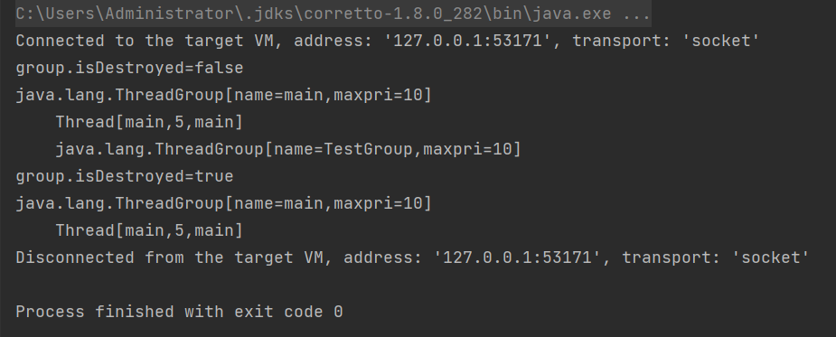 import java.util.concurrent.TimeUnit;public class ThreadGroupBasic {public static void main(String[] args) {ThreadGroup group = new ThreadGroup("group1");Thread thread = new Thread(group,() -> {while(true) {try {TimeUnit.SECONDS.sleep(1);} catch (InterruptedException e) {e.printStackTrace();}}}, "thread");thread.setDaemon(true);thread.start();ThreadGroup mainGroup = Thread.currentThread().getThreadGroup();System.out.println("activeCount=" + mainGroup.activeCount());System.out.println("activeGroupCount=" + mainGroup.activeGroupCount());mainGroup.list();System.out.println("--------------------------");System.out.println("parentOf=" + mainGroup.parentOf(group));}}