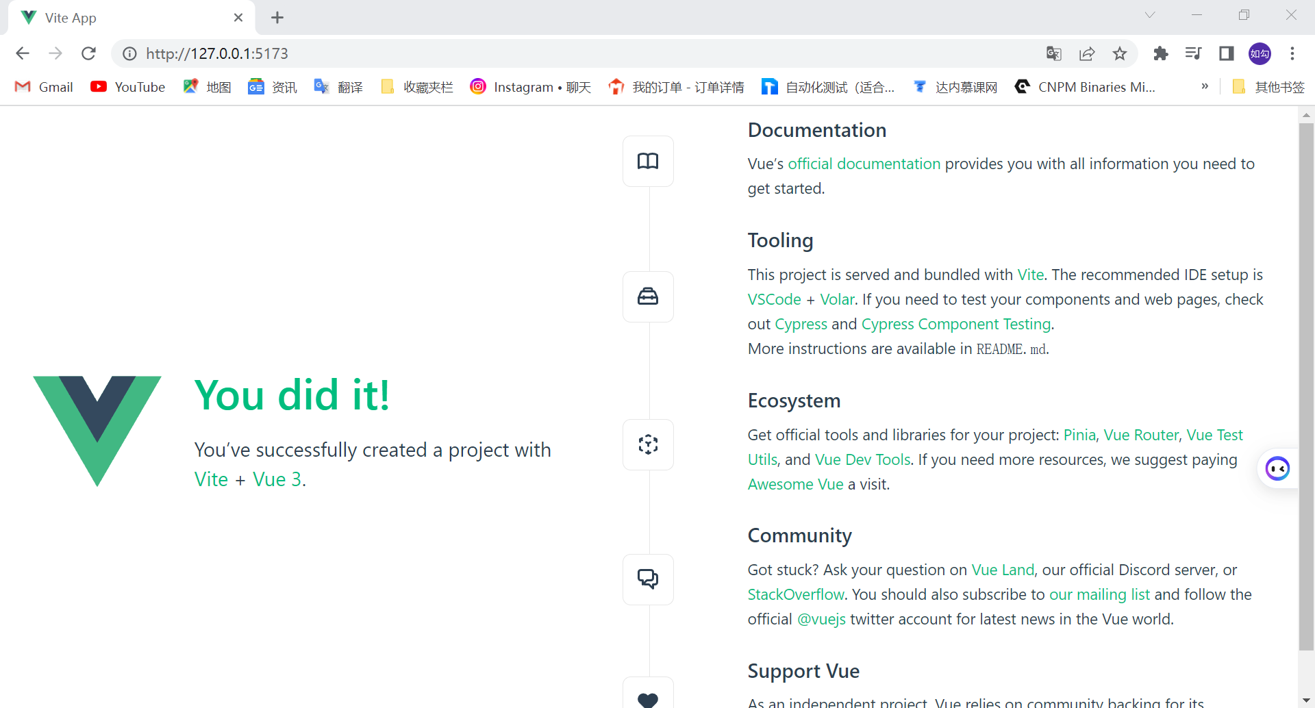 # 前往要保存项目的路径下npm init vue@latest# Need to install the following packages:# create-vue@3.6.1Ok to proceed? (y) y# Vue.js - The Progressive JavaScript Framework? Project name: » vue-lgq # 项目名称,名字不要出现大写? Add TypeScript? » No / Yes # 是否添加一个ts,默认为NO,直接回车就可以? Add JSX Support? » No / Yes #是否添加支持JSX语法,默认是No,直接回车就可以? Add Vue Router for Single Page Application development? » No / Yes # 是否添加一个vue router 直接跳过? Add Pinia for state management? » No / Yes # 是否添加一个状态管理,直接选择No? Add Vitest for Unit Testing? » No / Yes # 是否添加测试文件,选择No# Scaffolding project in D:\vue_test\vue-lgq...# Done. Now run: #你接下来要执行的命令cd vue-lgqnpm install # 只要不报红色的error就是成功npm run dev # 出现下列输出代表运行成功# > vue-lgq@0.0.0 dev# > vite# VITE v4.3.4 ready in 838 ms# ➜ Local: http://127.0.0.1:5173/# ➜ Network: use --host to expose# ➜ press h to show help# 启动 http://127.0.0.1:5173/