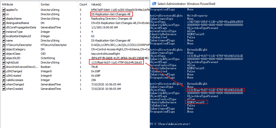 Get-ObjectACL "DC=security,DC=local" -ResolveGUIDs | ? {($_.ActiveDirectoryRights -match 'GenericAll') -or ($_.ObjectAceType -match 'Replication-Get')}# ORGet-ObjectAcl -DistinguishedName "DC=Security,DC" -ResolveGUIDs | ?{($_.IdentityReference -match "studentx") -and (($_.ObjectType -match 'replication') -or ($_.ActiveDirectoryRights -match 'GenericAll'))}