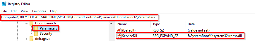 在这个过程中运行的服务是作为DLLs实现的。要实现的DLL存储在ServiceDLL的 Parameters 的服务注册表中。完整的路径是 HKLM\SYSTEM\CurrentControlSet\Services\SERVICE NAME\Parameters