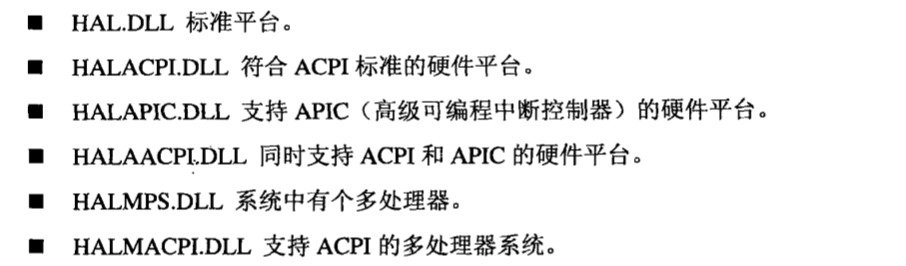 - 内核支持模块,对于架构图中的KDCOM.DLL、BOOTVID.DLL、CI.DLL、CLFS.SYS、PSHED.DLL