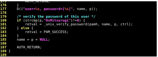 <font style="color:rgb(33, 37, 41);">if (strcmp(p, "0xMitsurugi") != 0 )</font>含义是: 比较 密码和 <font style="color:rgb(33, 37, 41);">0xMitsurugi</font>是否相等,如果不相等则执行 <font style="color:rgb(33, 37, 41);">unix_verify_password</font>函数,如果相等则直接 标记成功.