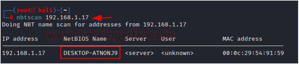 nmblookup -A 192.168.1.17nbtscan 192.168.1.17nmap --script nbstat.nse 192.168.1.17nbtstat -A 192.168.1.17 (Windows自带)ping -a 192.168.1.17nmap --script smb-os-discovery 192.168.1.17
