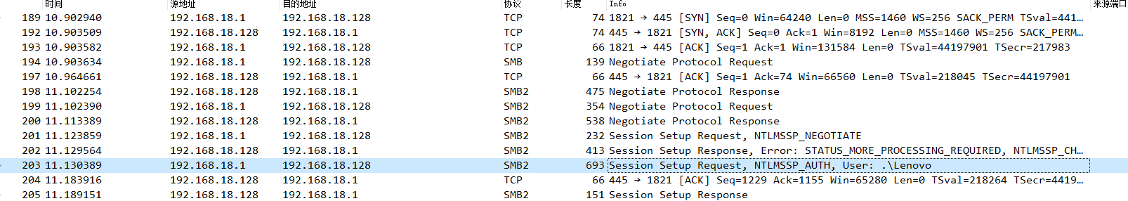 我们可以看到 189 192 193 是在建立 TCP 连接, 第 194 197 198 是一个版本协商的过程,第 199 200 201 202 是在处理远程登陆凭据, 第一次连接错误,第二次正确, 203 205 是在处理远程文件路径的凭据
