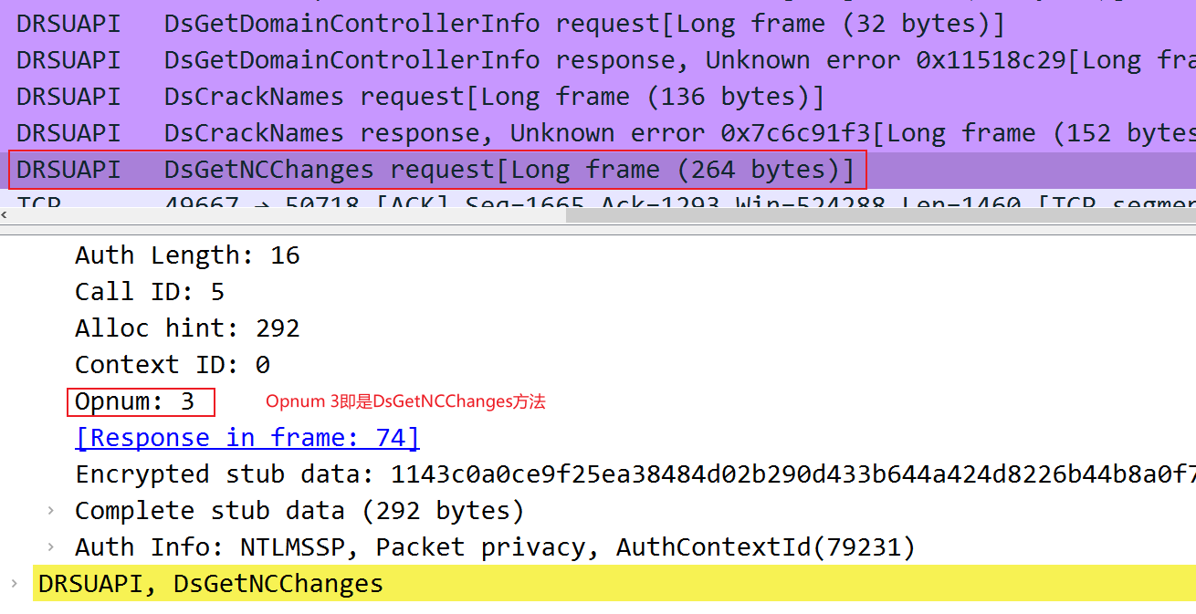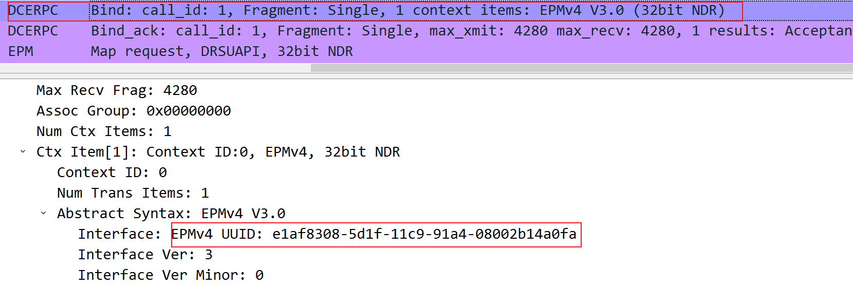 客户端并不知道远程服务所在端口,因此需要先调用RPC Endpoint Mapper(EPM)服务来查询,EPM使用的135端口,对应UUID为E1AF8308-5D1F-11C9-91A4-08002B14A0FA,EPM接口中opnum为3的方法(ept_map)即提供了对某个RPC服务所在位置的查询功能。以dcsync用到Directory Replication Service (DRS) Remote Protocol为例,抓包看一下RPC调用过程。