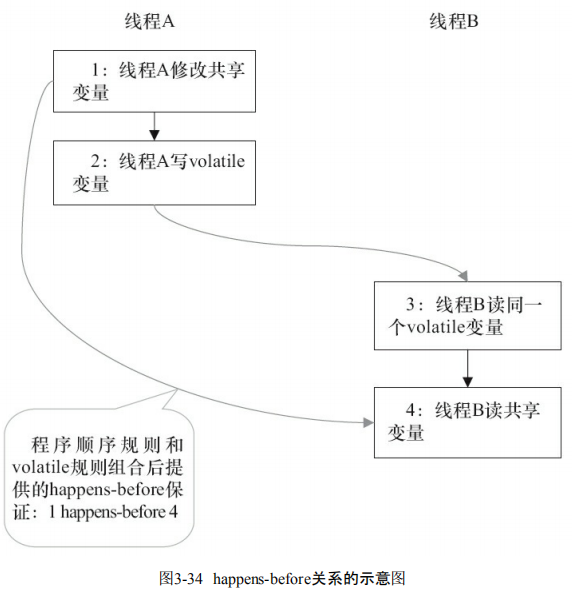 - 2 happens-before 3是由volatile规则产生。对一个volatile变量的读,总是能看到(任意线程)之前对这个volatile变量最后的写入。因此,volatile的这个特性可以保证实现volatile规则。