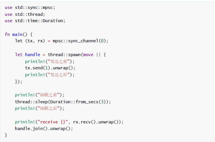主线程因为睡眠阻塞了3秒,因此并没有进行消息接收,而子线程却在此期间轻松完成了消息的发送。等主线程睡眠结束后,才姗姗来迟的从通道中接收了子线程老早之前发送的消息。从输出可以看出,发送之前和发送之后是连续输出的,没有受到接收端主线程的任何影响,因此通过 mpsc::channel** 创建的通道是异步通道**