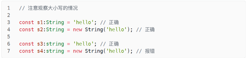 建议只使用小写类型,不使用大写类型。因为绝大部分使用原始类型的场合,都是使用字面量,不使用包装对象。而且,TypeScript 把很多内置方法的参数,定义成小写类型,使用大写类型会报错