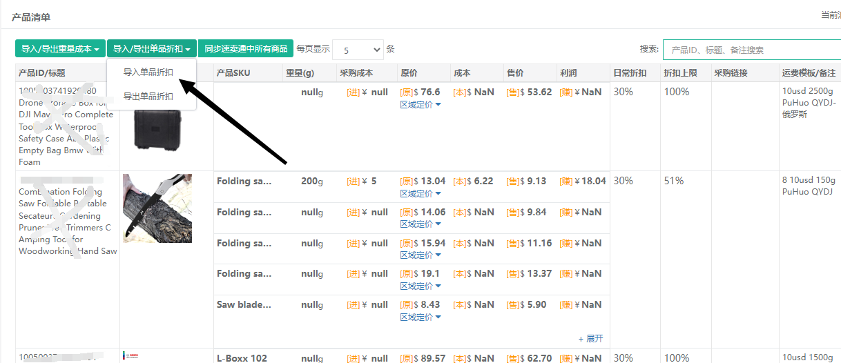 你可以在速卖通的“营销活动-店铺活动-单品折扣”中,导出商品和折扣信息,把导出的Excel,直接导入到“商品利润管理中”。这样可以确保速卖通中的折扣与商品利润管理中的折扣保持一致,进一步保证售价、利润的准确。