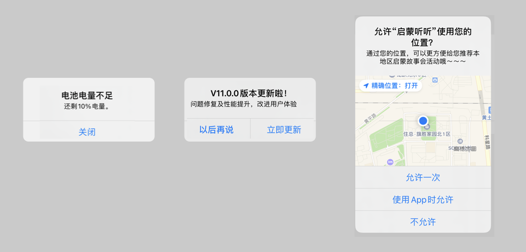 警告对话框因触发场景和任务类型的不同(例如:指纹识别、WiFi 源选择、位置授权、文本及密码输入等场景),往往需要添加额外的内容元素(如:指纹示意图标、输入框、地图、WiFi 列表等)。但不管添加这些元素后,导致框体视觉差异有多大,都不能改变其警告对话框(Alert)的控件属性。(很多文章对包含有不同内容元素的警告对话框,采用了新的属性命名方式,这种命名方式显然是不当的)