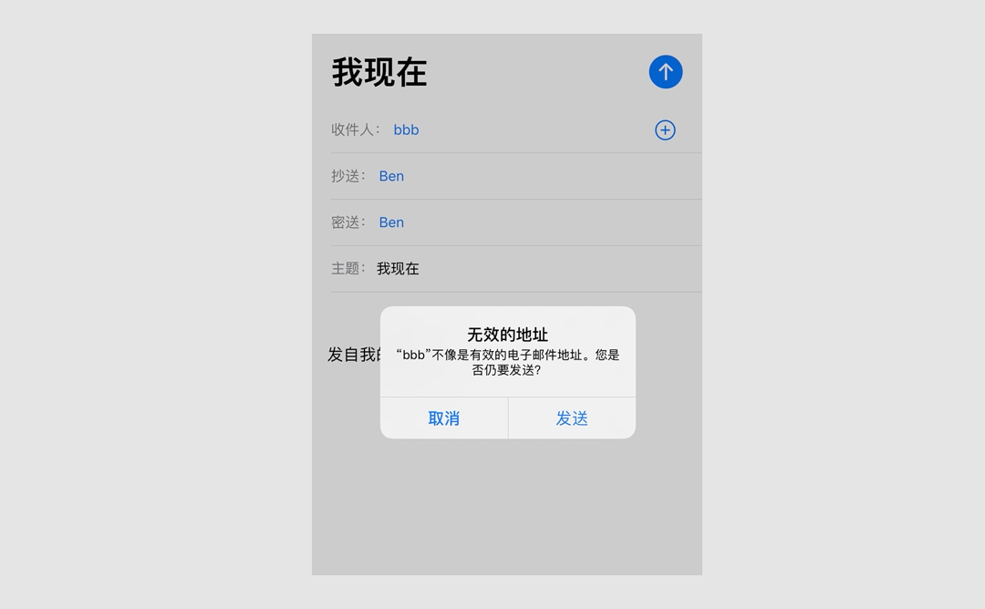 在 iOS 系统中,当用户输入的内容,不符合输入要求时,通常不会打断用户的正常操作,只有当全部的输入完成后,执行提交时,系统才会以警告对话框的方式,提示错误所在。