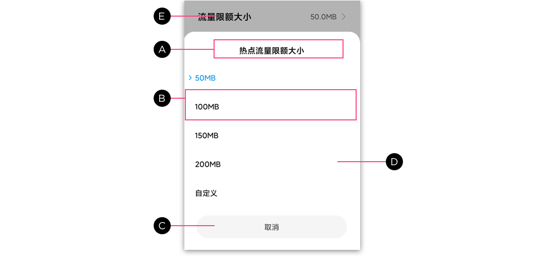 底部选项菜单由以下元素构成:标题(A)、选项条(B)、取消按钮(C)、面板容器(D)和模态遮罩层(E)