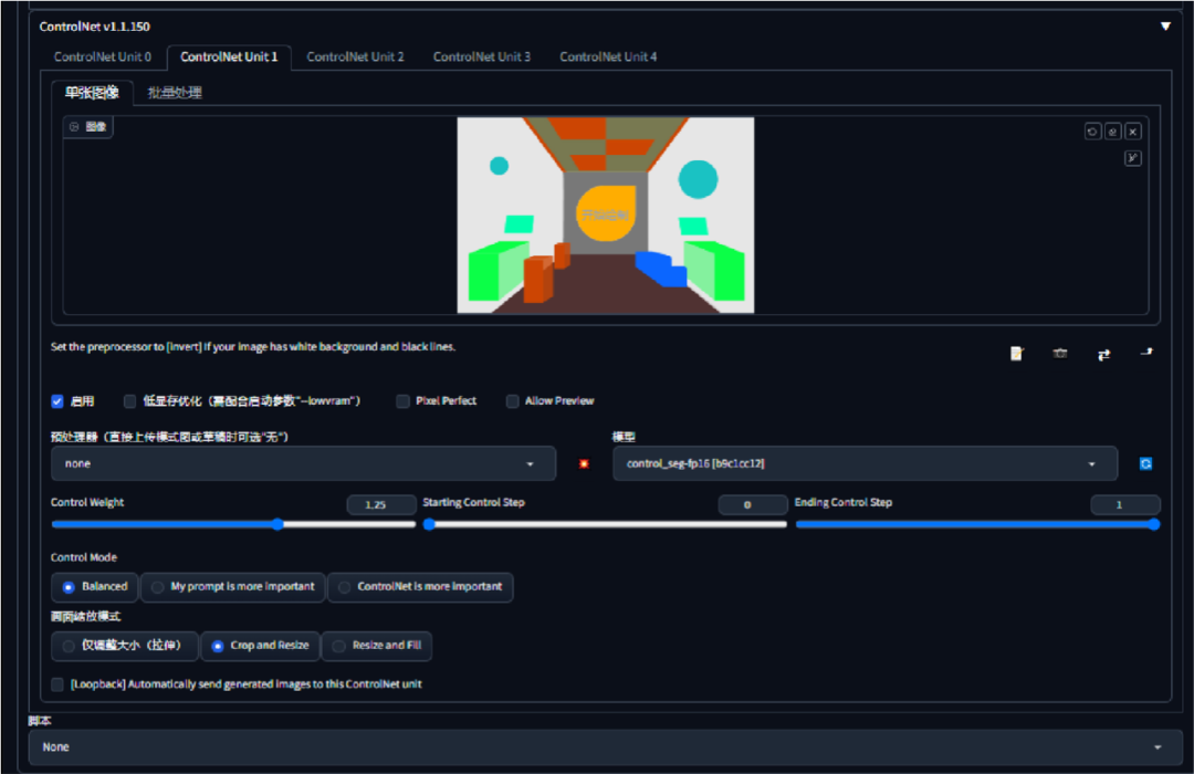 第二步:根据画面需要对场景内的物体进行材质更换(这一步需要配合关键词即画面中出现的材质需要在关键词中也对应提及,关键词的重要程度要用()强调)同样也借助control net插件里选择seg模型,配合第一步的操作双开control net 模型,SEG权重的大小数值,决定最终呈现的效果。