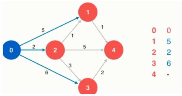 访问 顶点 3,则 0->2->3的路径长为5,此时就不需要考虑0->3权为6的边了。