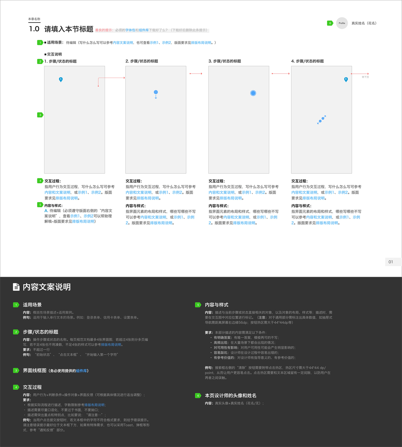 我们在做规范,那在设计规范时候更应该有自己的规范。每位设计师都有自己的设计风格,但我们在做同一件事情,需要统一交互文档内的所有内容形式,在文档排版部分,需要统一标题字体、内容字体、段落分部、流程链接;在交互说明部分,需要包含组件场景、交互流程、用户行为、交互样式、界面元素和样式。下图参考: