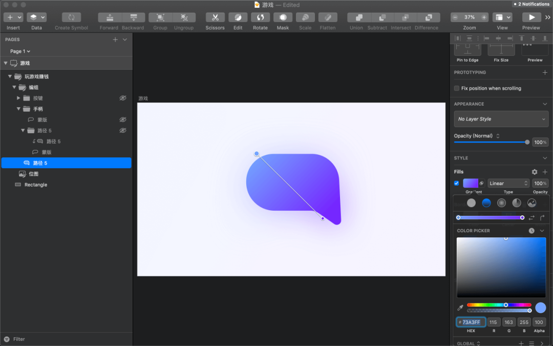 - 第一步:首先在Sketch中绘制游戏手柄图形,填充渐变色,色值为:#73A3FF - #7526FF 想要效果更好可适当添加色韵(弥散阴影)