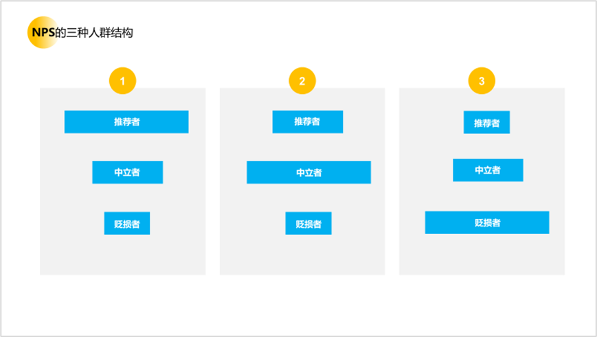 - 满意度是看重整体所有用户的评价,而NPS更加关注两头的用户,即口碑推荐者和贬损用户。