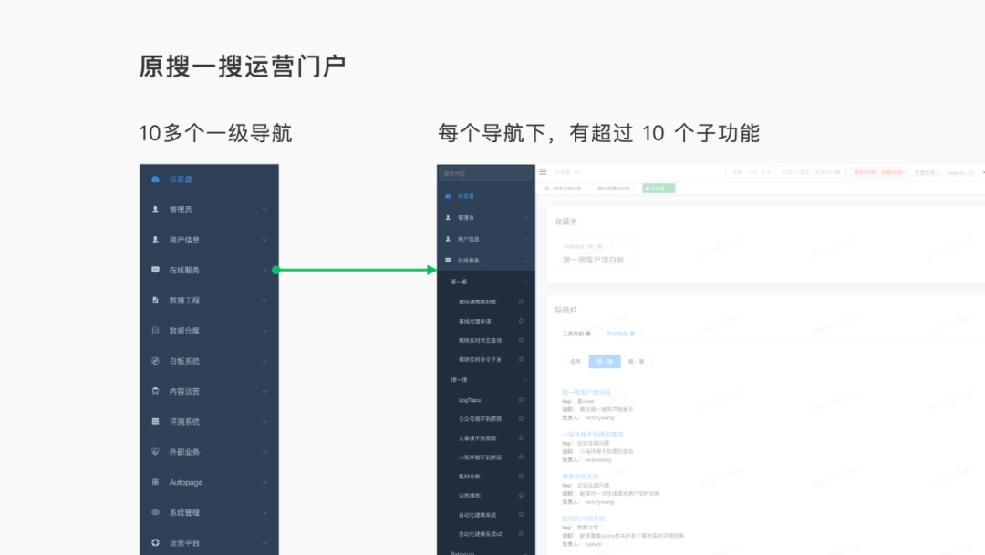 在内部工具门户的改版项目中,产品经理原来“变得更好看一点”的需求,作为设计师的我们是通过定位问题、推导功能来解决的:定位到门户信息混乱问题,针对性地使用信息分流与场景化查找的方法解决。