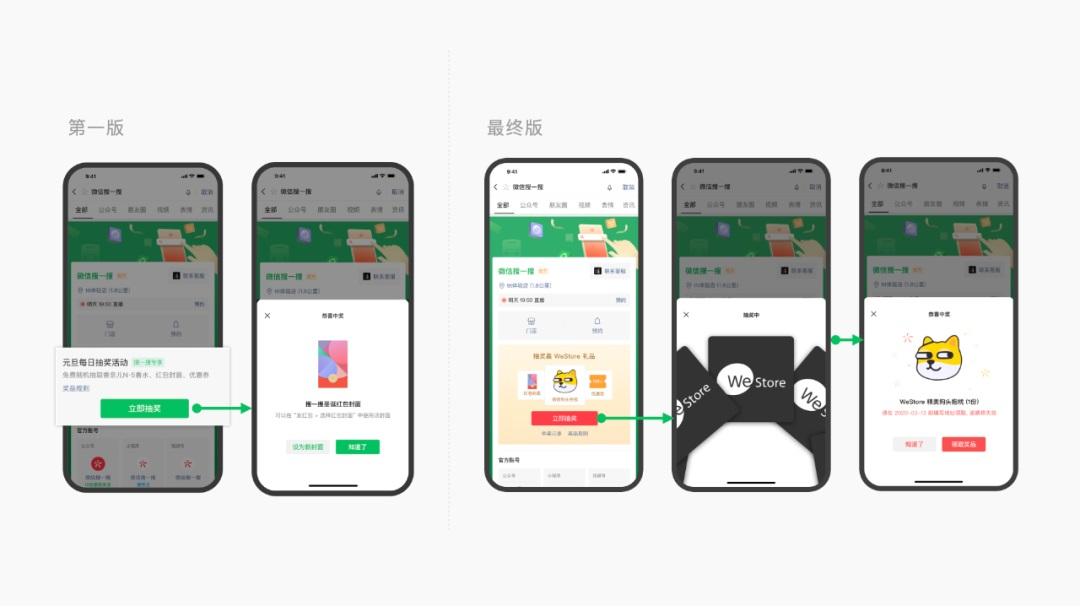 对比第一版方案和最终方案,虽然完成的是相同的功能,但后者采用适当的形式突出了奖品,增加了对用户的吸引力;用红和金的配色,烘托了更热闹的氛围;增加了抽奖过程,提升了仪式感。