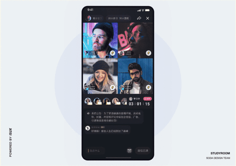 直播上麦是自习室的核心功能,每个自习房间会提供四个麦位,用户通过直播自己的学习画面来达到一个自我监督的作用。因为不同的手机摆放习惯,我们统一调整了画面方向,通过优化观感体验从而提升自习室内的学习氛围。