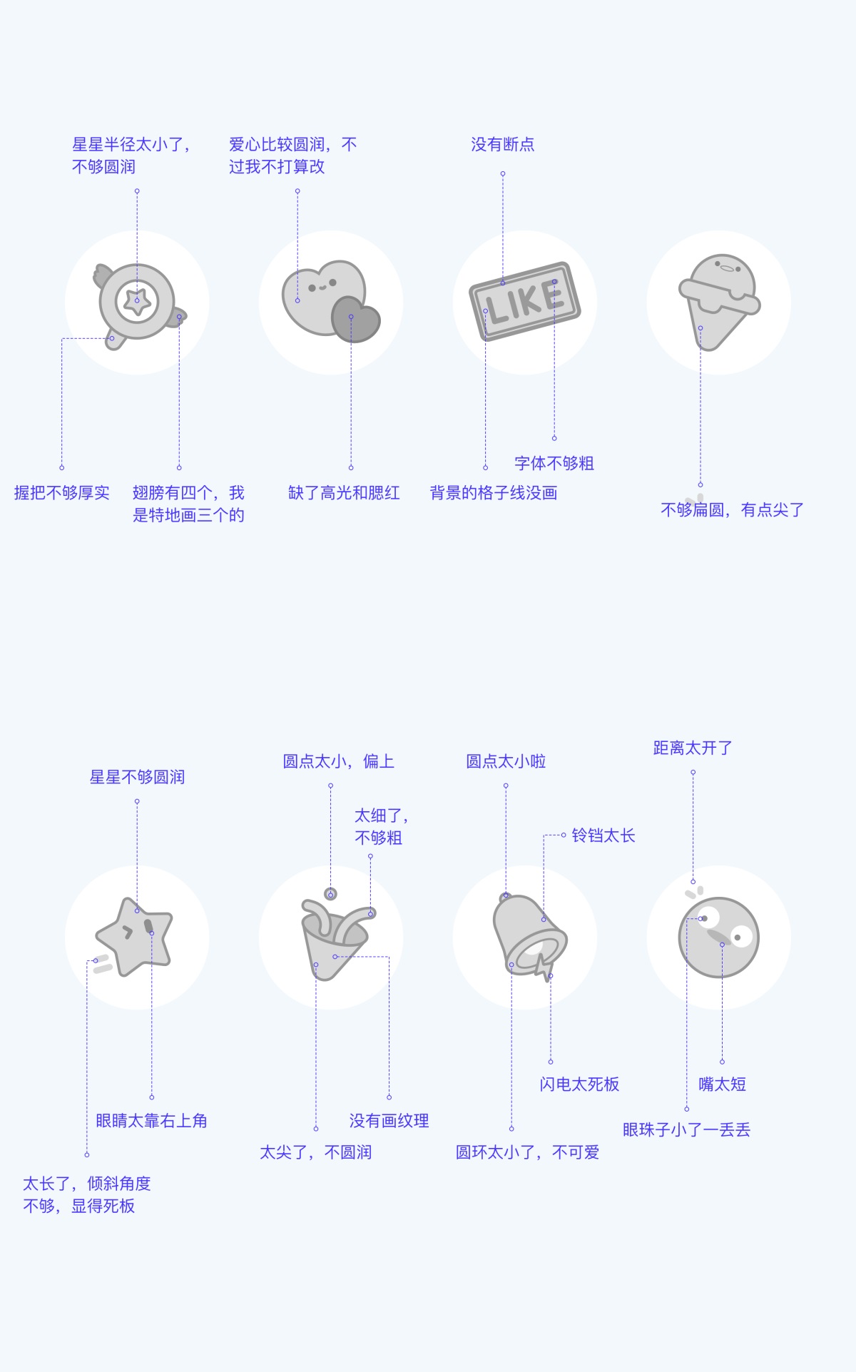 定义了大概的体量之后,我会观察图标大致的形状和角度,凭印象先把造型做出来。过程中没有把原作品放在旁边,最多在忘记的时候去看一眼。这样做的好处是,可以发现自己观察的时候漏了什么(这个方法是跟菜心学的)。下图就是第一次临摹的草稿,orz…铃铛最不好画了。