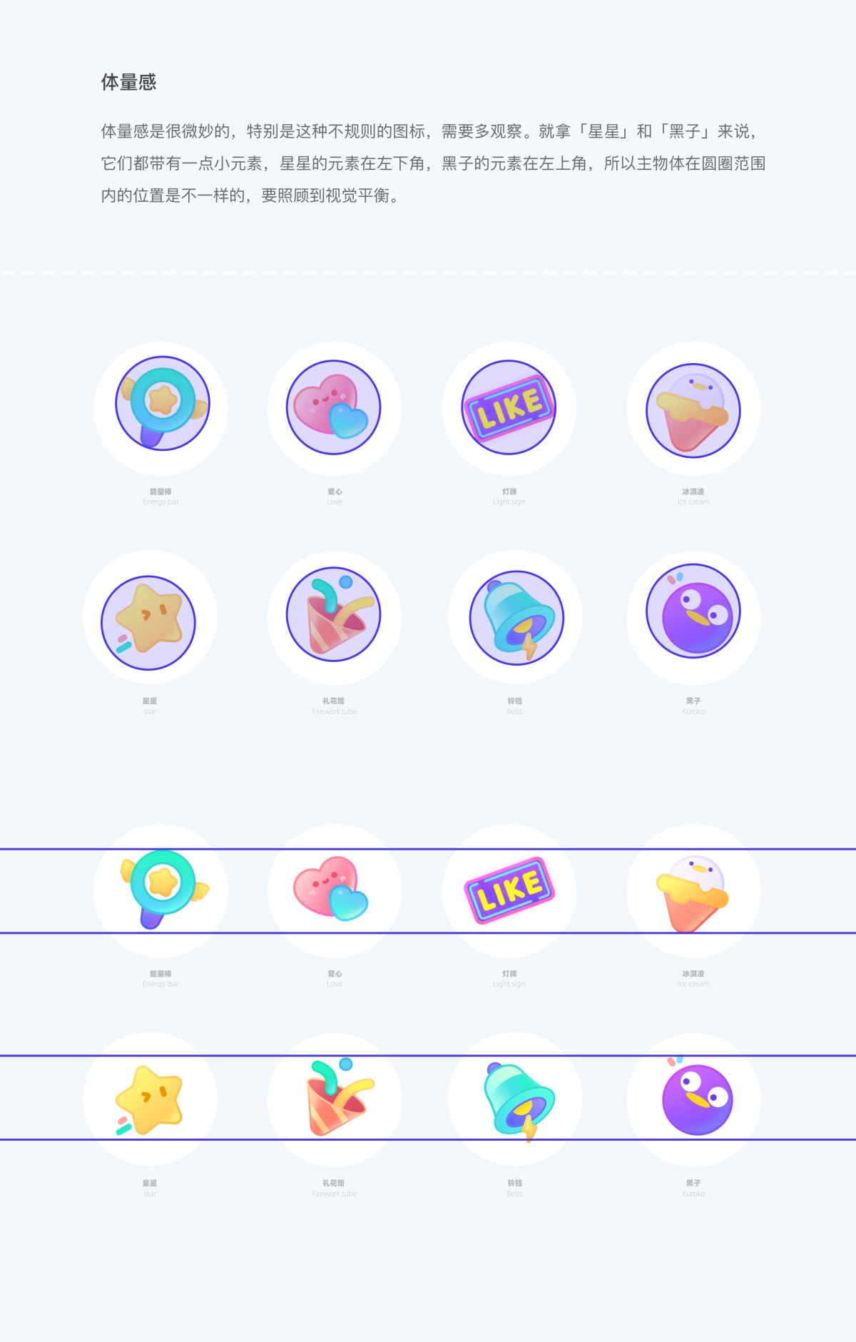 从作者的表现来看,光源在左上角,因此所有的图标应该遵循同一光源方向的原则。光源的表现会因为材质的不同而不同。比如「LIKE 灯牌」带有自发光、「铃铛」带有高光。所有物体的反光比受光面要亮一点,让人感觉很通透。