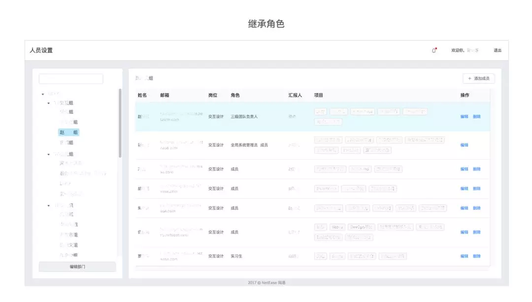 继承关系常常来源于公司团队的组织结构,此时常将角色与组织结构进行关联达到继承角色模型的效果;如下图所示的赵同学,其角色是“三级团队负责人”,与其并列的小组中有多个“三级团队负责人”的角色,但依附于左侧的组织结构树,各级负责人仅有查看和操作自己下属子节点的权限。