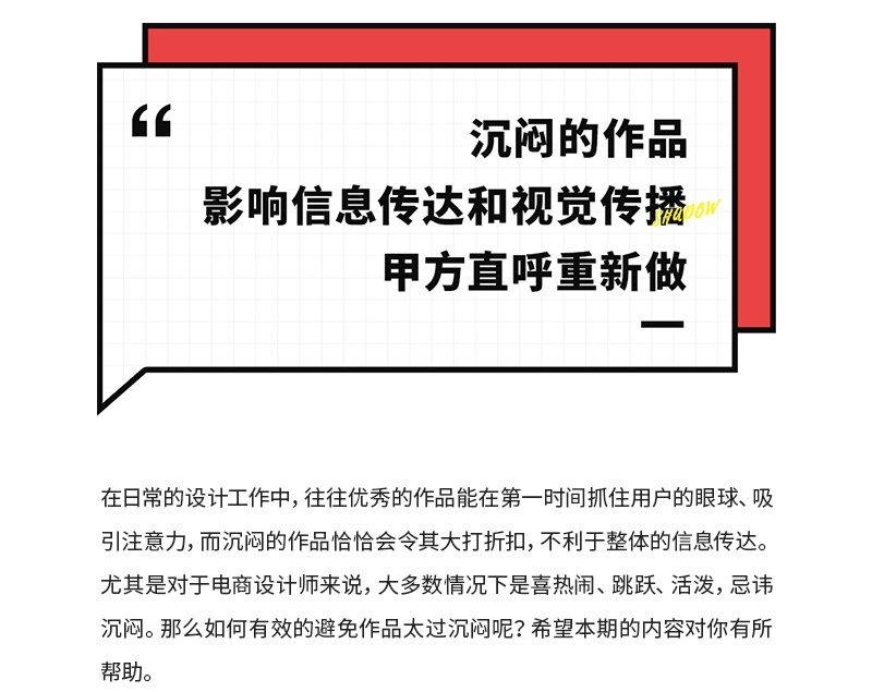 在日常的设计工作中,往往优秀的作品能在第一时间抓住用户的眼球、吸引注意力,而沉闷的作品恰恰会令其大打折扣,不利于整体的信息传达。尤其是对于电商设计师来说,大多数情况下是喜热闹、跳跃、活泼,忌讳沉闷。那么如何有效的避免作品太过沉闷呢?希望本期的内容对你有所帮助。