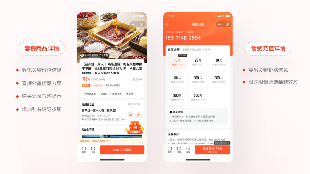 强化关键内容信息:详情页是商品价值与信息的洼地,用户需要在众多内容中做出决策,那么对详情页重要信息的突出则是提升用户决策效率的关键。在套餐商品详情的设计策略上我们主要做了以下几件事:1.强化价格信息的视觉重心,重点突出折扣价对比;2.在价格下方同时露出立减金额的标签,同样是 1000 元的商品,直降 100 元和打 9 折在数额上虽然没有任何区别,但是用户会觉得直降 100 元的优惠力度更大,更好地提升用户的感知价值;3.增加用户购买记录的气泡提示,给用户一种值得买的心理暗示,利用从众心理去刺激用户下单购买;4.底部新增分享赚钱悬浮按钮,对用户进行利益引导,刺激用户行为。