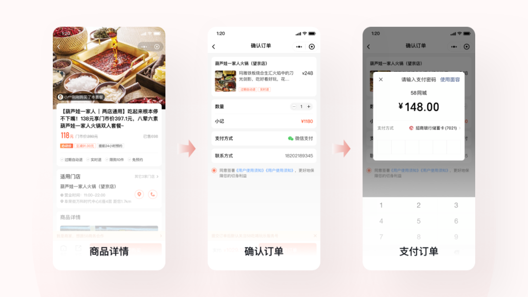 简化支付行为路径:当支付流程的路径相对较深时,可能会导致用户产生操作效率较低的认知,容易中断操作流程,从而导致用户的流失。因此在产品设计上我们借助微信生态便捷支付的属性,减少了页面之间过多的层级跳转,以达到简化支付路径的目的,让用户的购买行为更加地顺畅,进一步提升用户决策效率,下图主要以套餐商品的支付流程为例说明。