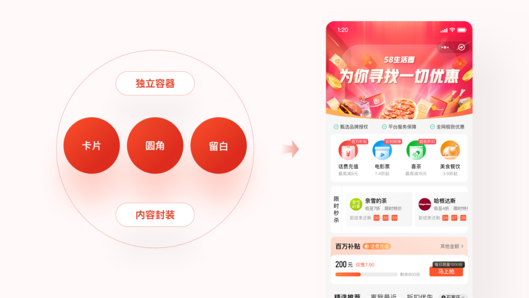 少即是多贯穿始终:其实设计师往往被要求在仅限的页面空间里尽可能展示更多信息,然而在这样的诉求下我们的界面常常会失去很多留白空间,导致信息密度会很大,这样反而会影响用户的阅读效率,甚至降低用户浏览欲望。因此在首页的设计策略上我们对各模块内容之间保持充分的留白空间,简化分割线的运用,让界面更加简洁清爽;而对于信息传达的效率而言,我们运用了卡片化的设计来组织各模块的功能结构,卡片使页面信息更加聚焦,能帮助用户在浏览中更快更高效地识别有效信息;同时配合使用大圆角的设计语言,让页面视觉上更具有亲和力,也符合我们年轻的用户基调。