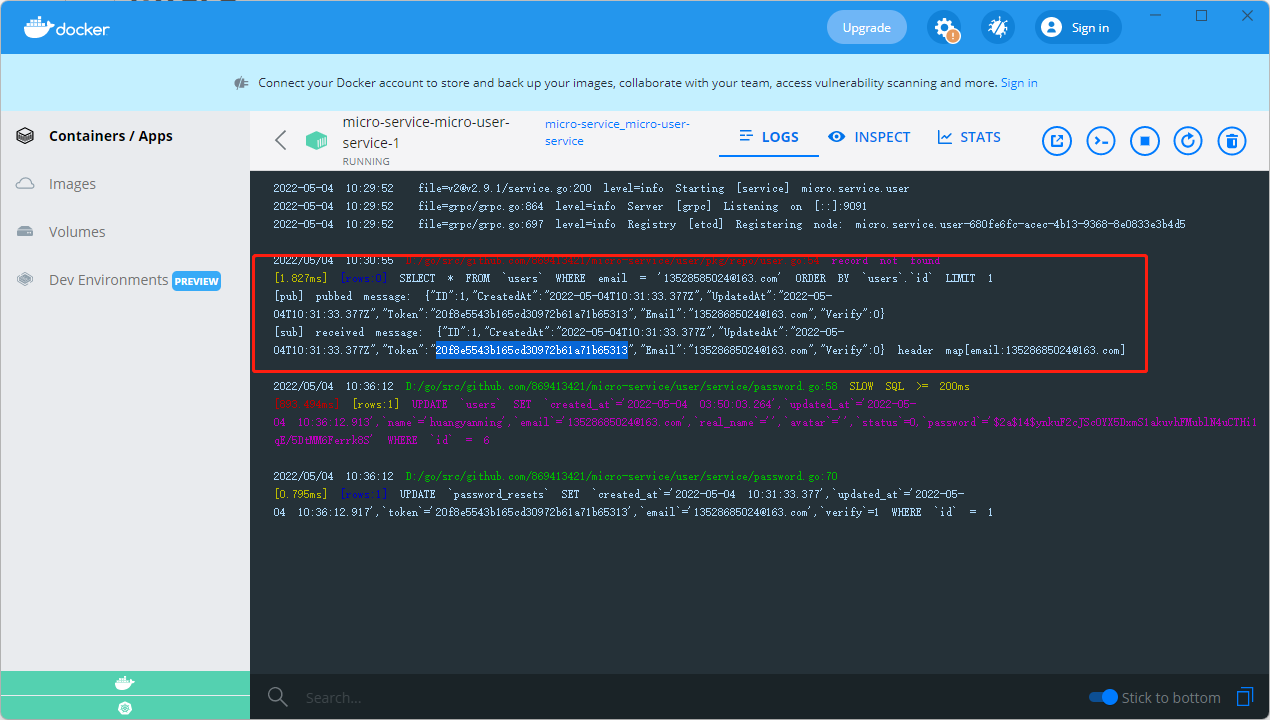 调用了创建重置密码的记录后我们可以看到发布订阅代码中打印的相关信息都显示了
