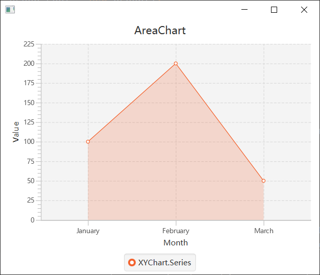 import javafx.application.Application;import javafx.scene.Group;import javafx.scene.Scene;import javafx.scene.chart.AreaChart;import javafx.scene.chart.CategoryAxis;import javafx.scene.chart.NumberAxis;import javafx.scene.chart.XYChart;import javafx.stage.Stage;public class Main extends Application {public static void main(String[] args) {launch(args);}@Overridepublic void start(Stage primaryStage) {primaryStage.setTitle("");Group root = new Group();final CategoryAxis xAxis = new CategoryAxis();final NumberAxis yAxis = new NumberAxis();xAxis.setLabel("Month");yAxis.setLabel("Value");final AreaChart<String,Number> areaChart = new AreaChart<String,Number>(xAxis,yAxis);areaChart.setTitle("AreaChart");XYChart.Series series = new XYChart.Series();series.setName("XYChart.Series");series.getData().add(new XYChart.Data("January", 100));series.getData().add(new XYChart.Data("February", 200));series.getData().add(new XYChart.Data("March", 50));areaChart.getData().add(series);root.getChildren().add(areaChart);primaryStage.setScene(new Scene(root, 500, 400));primaryStage.show();}}