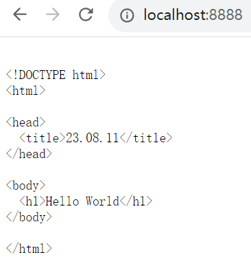 const http = require('http');const server = http.createServer((req, res) => {res.writeHead(200, { 'Content-Type': 'text/plain' });res.end(`<!DOCTYPE html><html><head><title>23.08.11</title></head><body><h1>Hello World</h1></body></html>`);});server.listen(8888, () => {console.log('Server running on port 8888');})
