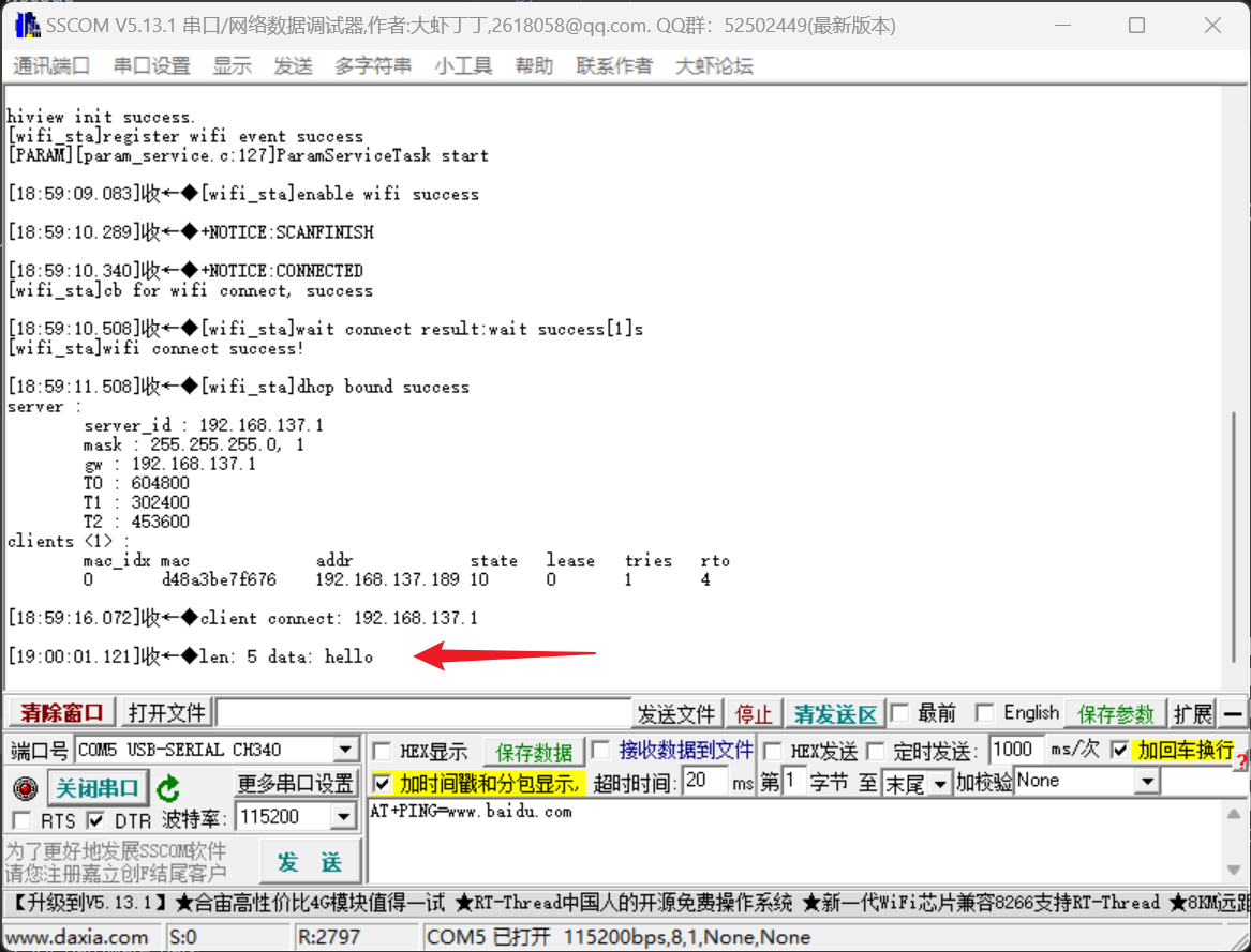 点击连接网络,查看串口打印:
