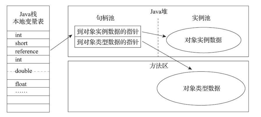 - 句柄,如果使用句柄访问的话,Java 堆中将可能会划分出一块内存来作为句柄池,reference 中存储的就是对象的句柄地址,而句柄中包含了对象实例数据与类型数据各自具体的地址信息,其结构如图所示: