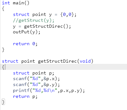 #include <stdio.h>#include <stdlib.h>//定义结构体struct point{int x;int y;};//定义 结构体 指针函数 or 指针函数struct point* getStruct(struct point*);//输出函数,其参数为结构体的值void outPut(struct point);//打印函数,其参数为结构体的指针void print(const struct point *p);int main(){struct point y = {0,0};getStruct(&y);outPut(y);outPut(*getStruct(&y));print(getStruct(&y));return 0;}struct point* getStruct(struct point *p){scanf("%d",&p->x);scanf("%d",&p->y);printf("%d,%d\n",p->x,p->y);return p;}void outPut(struct point p){printf("%d,%d",p.x,p.y);}void print(const struct point *p){printf("%d %d\n",p->x,p->y);}