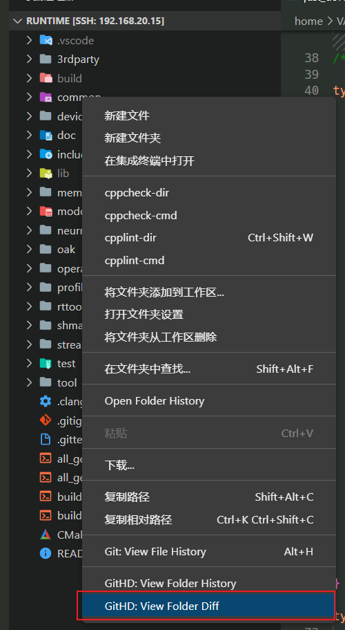 2 在左侧资源管理器中右击根目录或某个目录,弹出的菜单中选择”GitHD:View Folder Diff“。