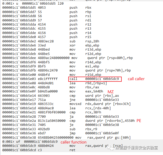 reflective loader 首先 call 000001c1`60bb5dc9 也就是caller()函 数,caller() 函数的实现就比较简单了,一共两条汇编指令,起作用就是返回下一条指令的地址: